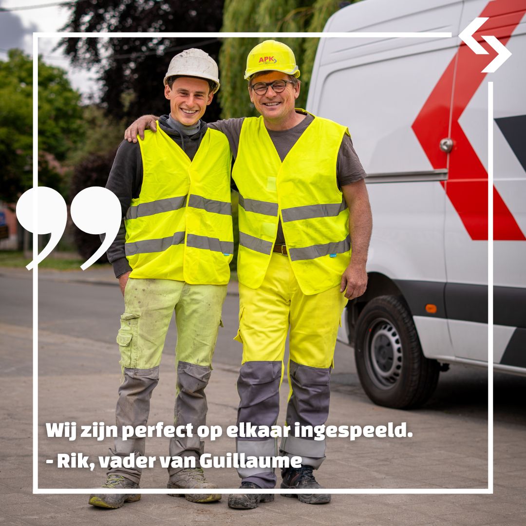 Rik en Guillaume werken voor APK Infra West in het Belgische Zedelgem dagelijks naast elkaar aan de ondergrondse infrastructuur van morgen. Rik werkt al 20 jaar in de infrastructuursector, Guillaume stapte enkele jaren geleden mee in het vak. “Mijn vader baat een landbouwbedrijf in bijberoep uit, waar ik van kindsbeen af al bijklus. Samenwerken doen we dus al langer. Toen ik de kans kreeg om mee met mijn vader in een team te stappen, heb ik dan ook niet lang getwijfeld.”